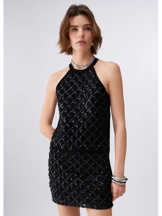 Questo top illumina i tuoi look con un'elegante trama gioiello, minuziosamente ricamata sulla parte frontale. Il taglio halter lo rende la scelta ideale per serate estive ed eventi esclusivi.