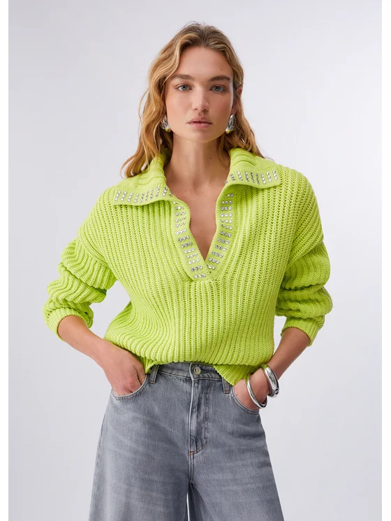 Accenti destroyed e piccole borchie dalla galvanica silver per illuminare anche i look più essenziali. Questo morbido maglione di cotone regala un tocco rilassato ai tuoi abbinamenti city-chic.