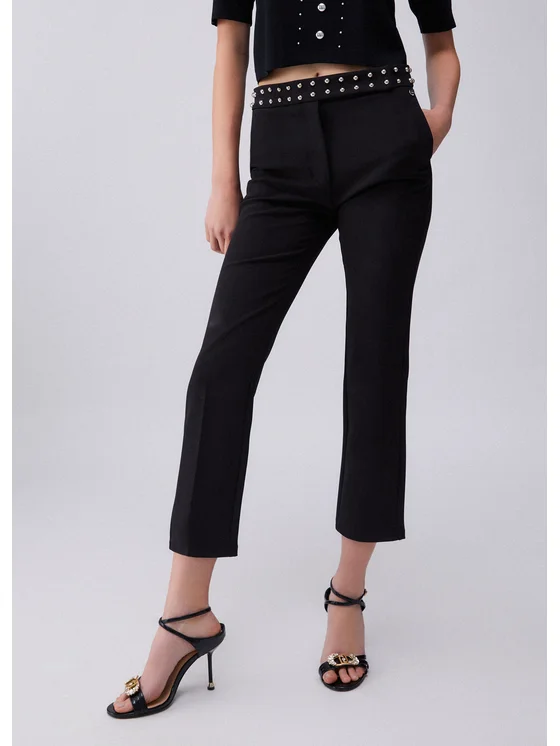 L'eleganza formale trova una nuova dimensione glam grazie a questi pantaloni chino in crêpe. Il cintone è arricchito da piccole borchie metalliche, che impreziosiscono senza appesantire. L'abbinamento perfetto? Una camicia fluida e il blazer coordinato.