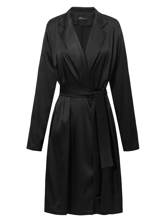 Il kimono/accappatoio Marion in satin nero morbido e delicato è un modello elegante e versatile: può essere indossato come vestaglia, abito o raffinato coprispalle. La linea ampia, ispirata al classico trench, cade splendidamente sulla silhouette e si adatta a diverse fisicità. All’occorrenza può essere stretto in vita con un’ampia cintura in satin per valorizzare le proporzioni. Il colletto con rever classico dona un tocco chic, mentre le maniche lunghe leggermente aderenti e la lunghezza 3/4 rendono il modello particolarmente femminile. È un complemento sensuale per i look notte, perfetto in abbinamento all’abito-sottoveste Jenny. Cucito in Polonia in manifatture familiari. La modella è alta 178 cm e indossa la taglia S.
