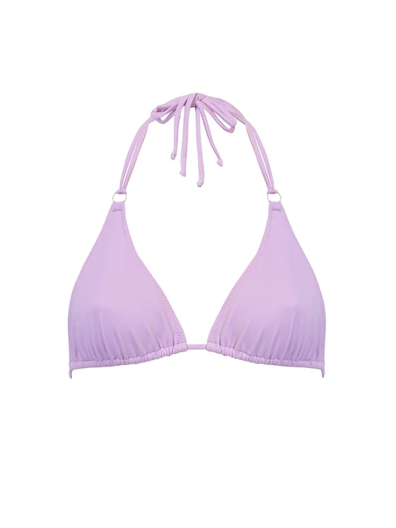 Il top bikini realizzato in tessuto ecologico color lilla chiaro è un modello senza tempo in chiave moderna. Le coppe triangolari con possibilità di inserire imbottiture push-up valorizzano ed esaltano il seno. Il design liscio, con lacci da annodare al collo e sulla schiena, permette una vestibilità perfetta, mentre i sottili laccetti sono ideali durante l’abbronzatura. Il modello Maui può essere indossato in modo classico oppure secondo il trend più attuale, annodato al contrario. Si abbina perfettamente agli slip delle linee Fiji e Kawai, ma può essere utilizzato anche in outfit estivi con shorts. I materiali della linea beachwear provengono da riciclo e sono certificati OEKO-TEX®. Composizione: 78% poliammide riciclata, 22% elastan. Il bikini è cucito in Polonia in manifatture familiari. La modella è alta 174 cm e indossa la taglia S.