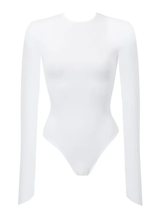 Il body Grace bianco e liscio, realizzato in microfibra, è una base versatile per tantissimi outfit, da quelli quotidiani ai look da sera. Le maniche lunghe e lo scollo alto e chiuso donano un tocco elegante e minimalista, valorizzando al tempo stesso la silhouette femminile. Il tessuto è estremamente morbido e piacevole al tatto, confortevole da indossare e si adatta perfettamente al corpo. I tagli sulle spalle aggiungono un dettaglio femminile, mentre gli scolli accentuati sul retro mettono in risalto la linea dei glutei. Il body è cucito in Polonia in manifatture familiari.