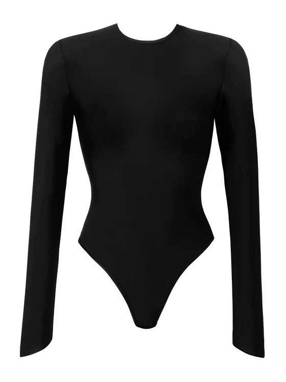 Body nero liscio realizzato in microfibra, con maniche lunghe e scollo chiuso. Body Grace mette in risalto le forme femminili ed è estremamente piacevole al tatto. Le ampie aperture sulla schiena valorizzano la linea dei glutei, mentre le spalle scoperte e la linea classica dello scollo aggiungono un tocco femminile. Perfetto per look quotidiani e per uscite serali.