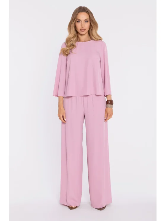 L'elegante blusa minimalista con una sottile lucentezza è una proposta moderna per le donne che apprezzano la semplicità senza tempo e i dettagli raffinati. Realizzata in tessuto liscio con una leggera lucentezza, riflette magnificamente la luce, conferendo allo styling un carattere elegante. Lo scollo a barca accollato espone sottilmente la linea del collo e delle clavicole, sottolineando la classe femminile. Il taglio morbido e leggermente oversize garantisce libertà di movimento e comfort, mentre le maniche a 3/4, leggermente svasate al polsino, aggiungono una finitura d'effetto all'insieme. È una blusa versatile, perfetta sia per i look da ufficio che per le uscite più eleganti.