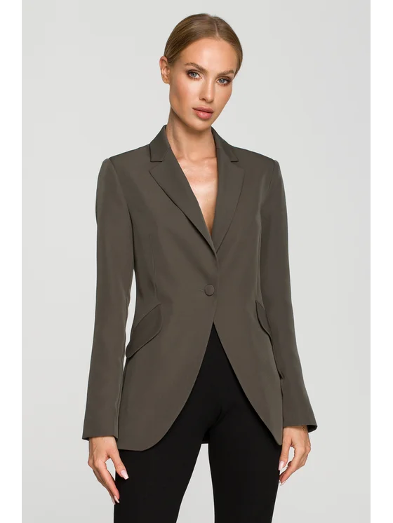 Oltre al classico colletto, questo blazer classico dal taglio femminile e aderente è dotato di tasche oblique applicate con pattine per rompere le convenzioni. Questo lo rende un abbinamento perfetto non solo con pantaloni eleganti, ma anche con pantaloni a campana alla moda o semplicemente con jeans.