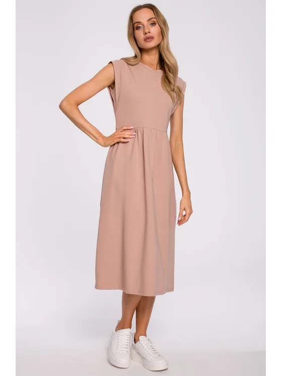 Abito in maglia di lunghezza media. Tagliato in vita con vita alta e gonna ampia, restringe otticamente il punto vita e, grazie al taglio dritto, snellisce ulteriormente l'intera silhouette. Ha maniche caratteristiche e molto corte e una scollatura incorporata. Ottimo sia per essere indossato tutti i giorni che come abito da cerimonia.