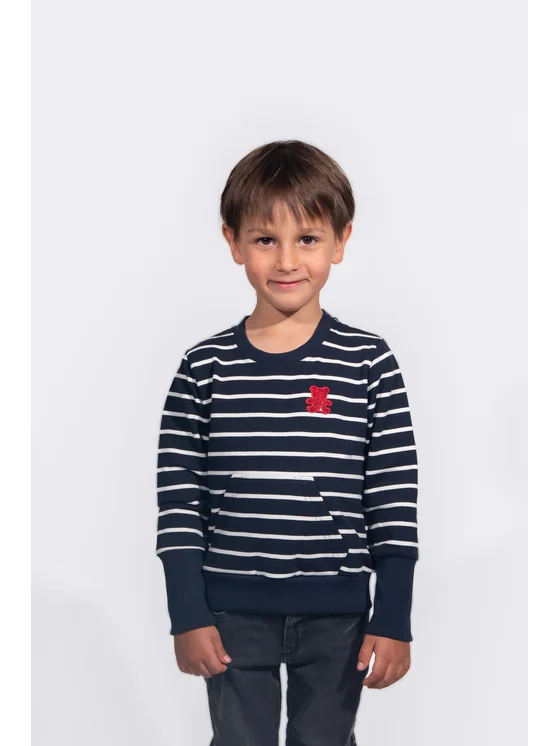 Felpa per bambini con tasca frontale. Una felpa che cresce con il bambino, grazie ai polsini allungati sulle maniche, la cui lunghezza può essere regolata. Il taglio basic della felpa è decorato da un'applicazione di zirconi a forma di orsetto. Sul retro, all'altezza del collo, è cucita un'etichetta jacquard con il logo. Il materiale, morbido al tatto e delicato sulla pelle, è certificato OEKO-TEX STANDARD 100.