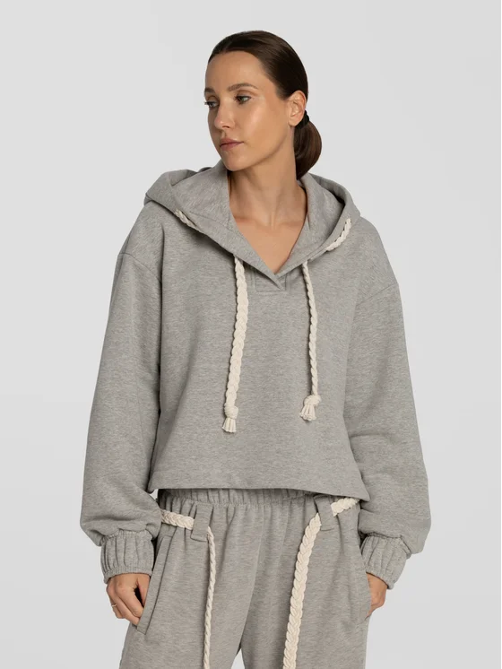 Felpa moderna e corta, con cappuccio ampio e caratteristico cordino intrecciato. Realizzata in morbida maglia di cotone, unisce comfort e semplicità raffinata. I polsini elasticizzati e la linea delle spalle leggermente abbassata donano un carattere rilassato ma distintivo. Il cordino a contrasto, in tonalità naturale, aggiunge un dettaglio stilistico unico. Perfetta per look quotidiani o come elemento sorprendente in outfit più eleganti. Da abbinare ai pantaloni Sento.Realizzata e progettata in Polonia. La modella è alta 173 cm e indossa la taglia XS/S.