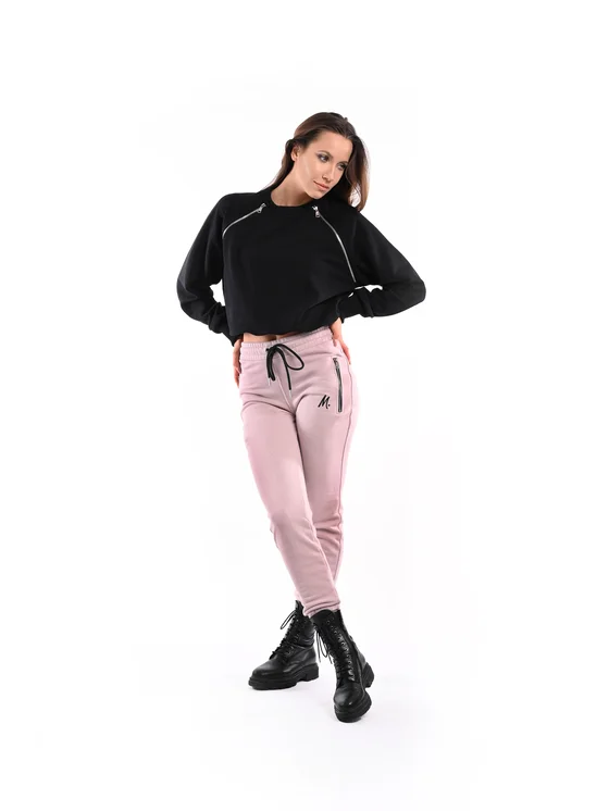 È una classica felpa da donna in stile raglan, con cerniere sul davanti lungo le clavicole e una cerniera sulla nuca. Ricamo "M" cucito nell'angolo inferiore destro.