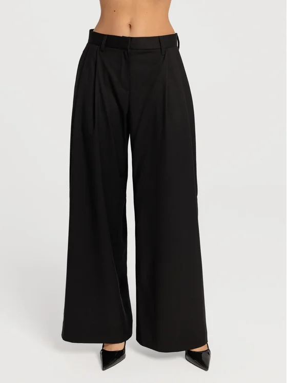 "Pantaloni a gamba ampia e dritta, con vita alta, progettati nello spirito dell’eleganza moderna. La piega stirata lungo la gamba slancia la silhouette e aggiunge un tocco classico. Realizzati in tessuto di viscosa che cade con grazia nel movimento e mantiene la forma per tutto il giorno. Realizzati e progettati in Polonia. La modella è alta 173 cm e indossa la taglia XS/S."