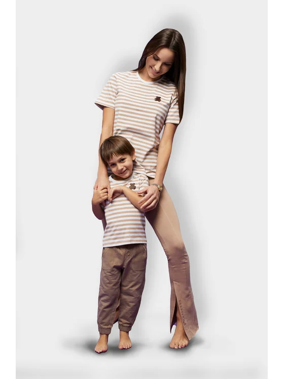 Questa maglietta è il giusto equilibrio tra oversize e slim fit, con moderne righe e maniche corte. Il taglio basic della maglietta è adornato da una patch di strass a forma di orsetto sul davanti. Sul retro, all'altezza del collo, è presente un'etichetta jacquard con il logo. Realizzata in un materiale morbido e delicato sulla pelle, ha la certificazione OEKO-TEX STANDARD 100.