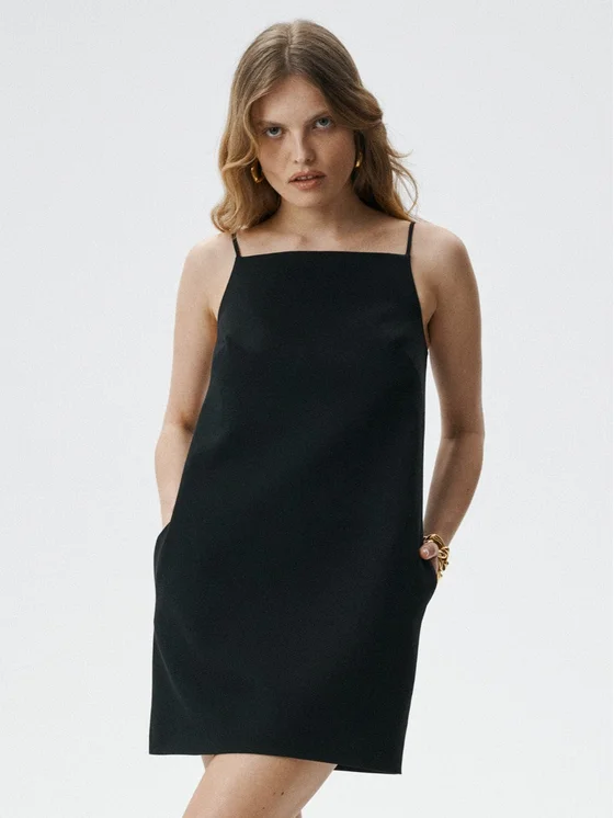 Mini dress dal taglio dritto con sottili spalline, realizzato in tessuto con trama decorativa.