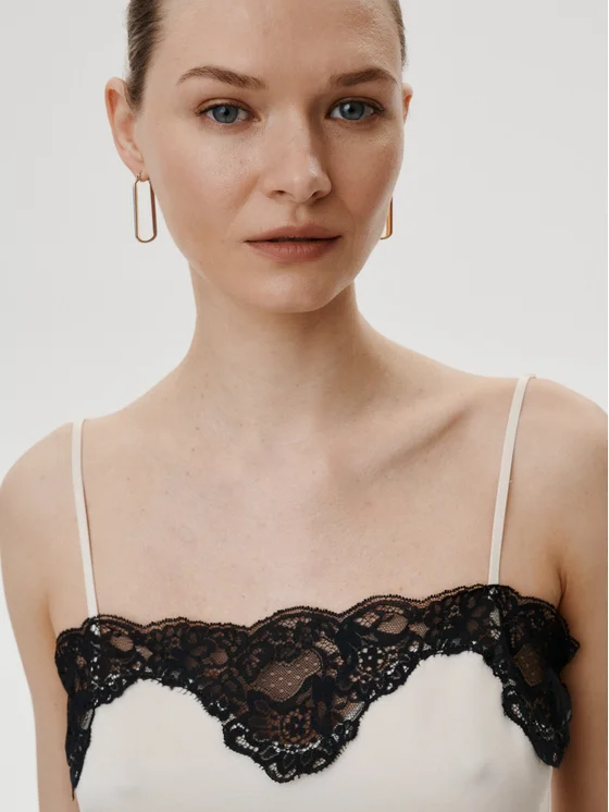 Top in stile night-to-day. Realizzato in satin di viscosa combinata con rayon, rifinito con un inserto in pizzo sullo scollo.