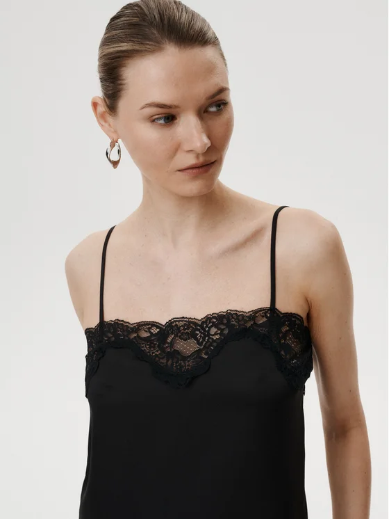 Top in stile night-to-day. Realizzato in satin di viscosa combinata con rayon, rifinito con un inserto in pizzo sullo scollo.