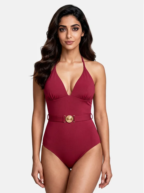 Questo elegante costume da bagno intero bordeaux con cintura decorativa e fibbia dorata è la chiave per un look da spiaggia raffinato. Le coppe triangolari imbottite con effetto push-up valorizzano e aumentano otticamente il seno, mentre le sottili spalline annodate al collo aggiungono un tocco di delicata eleganza. La cintura snellente in vita mette in risalto la silhouette, donandole proporzioni armoniose. Perfetto per spiaggia e piscina, rappresenta una base versatile per creare diversi outfit estivi, abbinandosi splendidamente a parei colorati e cappelli di paglia. Sentiti speciale e a tuo agio in ogni momento delle vacanze con Miss Lou.