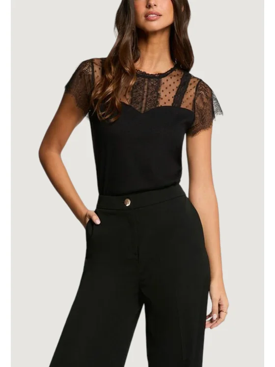 La t-shirt a maniche corte da donna Morgan De Toi modello 261-DAPHNE unisce eleganza e comfort in un capo versatile ideale per ogni occasione. Realizzata con una composizione di 61% poliestere riciclato, 33% viscosa e 6% elastam/lycra, garantisce una vestibilità morbida e flessibile. Il design raffinato è valorizzato dal delicato inserto in tulle trasparente con pois e dalle maniche corte in pizzo, che aggiungono un tocco femminile e sofisticato. Perfetta sia per un look da giorno che per una serata speciale, questa t-shirt si abbina facilmente a pantaloni eleganti o gonne per uno stile moderno e ricercato.