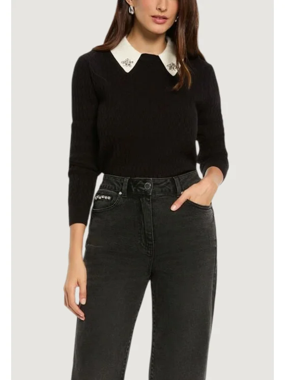 La maglia da donna Morgan De Toi modello 252-MTORIA è la scelta perfetta per chi desidera aggiungere un tocco raffinato al proprio guardaroba. Realizzata con una pregiata composizione di 50% viscosa, 30% poliestere e 20% poliammide, questa maglia garantisce comfort, morbidezza e resistenza. Il design presenta un elegante colletto decorato con dettagli gioiello applicati, che dona luminosità e stile al capo. Le maniche lunghe e il taglio aderente valorizzano la silhouette, rendendo questa maglia ideale sia per look casual che per occasioni più formali. Un capo versatile e di tendenza, perfetto per tutte le stagioni.