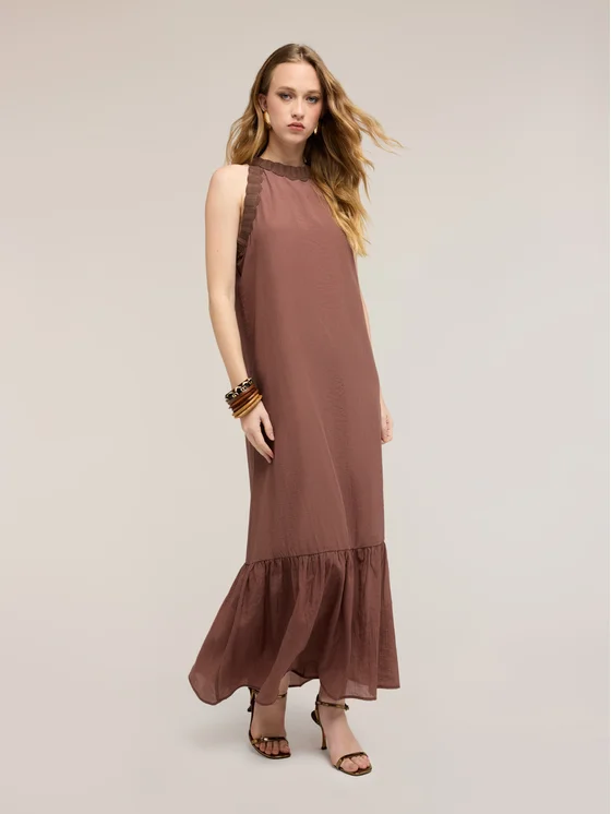 Vestito lungo in creponne misto lyocell; modello senza maniche con balza arricciata sul fondo; scollatura halter con bordo lavorato in maglia, apertura a goccia nel centro dietro.