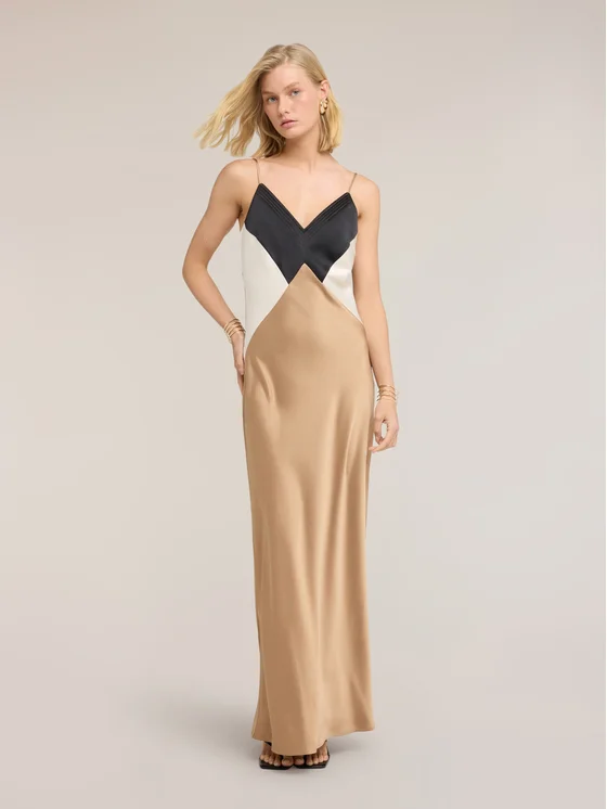 Vestito lungo in raso con design color block; spalline sottili, scollatura a V; linea scivolata con vestibilità aderente.