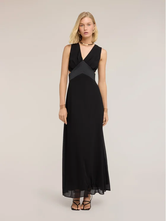 Vestito lungo in tessuto georgette; modello senza maniche con chiusura zip posteriore, lavorazione drappeggiata in vita con cut-out laterali; scollatura a V profonda con inserto in raso impunturato.