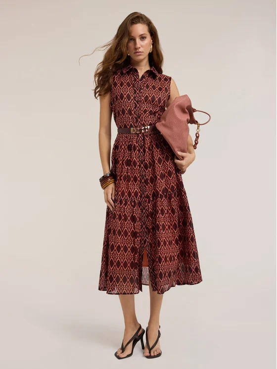 Vestito chemisier in cotone fantasia etnica con fodera interna; apertura frontale con colletto a vela e bottoni a vista; gonna lunghezza midi con balza arricciata