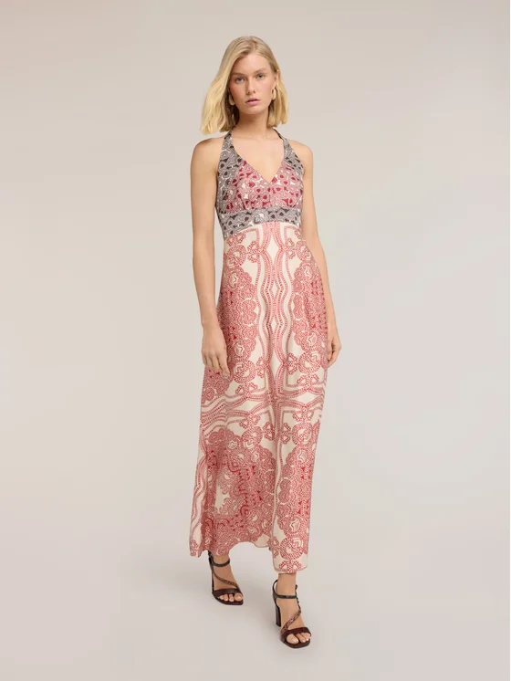 Vestito lungo in raso di viscosa stampa paisley; scollatura a V con spalline all'americana; apertura sulla schiena con chiusura a zip.