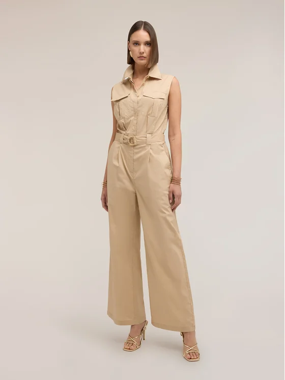 Tuta lunga in popeline; modello senza maniche con colletto classico, chiusura frontale con bottoni e zip, cintura in vita con fibbia a D; due tasche applicate sul petto con pattina, gamba dritta.