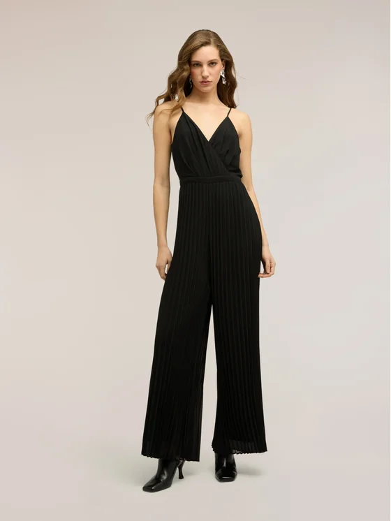 Tuta lunga palazzo in georgette; chiusura zip nel centro dietro, lavorazione plissé; scollatura a V con incrocio frontale, spalline sottili, modello senza maniche.