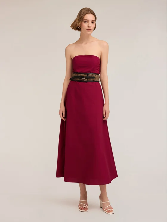 Vestito in popeline di cotone tinta unita; corpino a bustier con rinforzi interni e spalline regolabili staccabili; chiusura laterale con zip invisibile