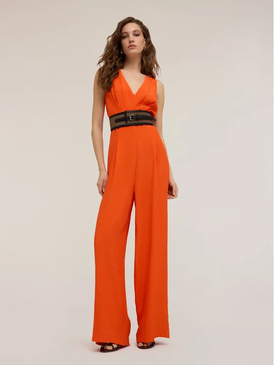 Tuta lunga in viscosa; corpino con scollatura a v e pieghe, chiusura con zip invisibile nel centro dietro; pantaloni a gamba larga con piega stirata nel centro