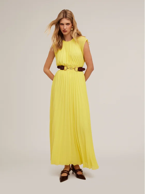 Vestito lungo con lavorazione plissé; scollatura tonda frontale con apertura a goccia posteriore; maniche corte ad aletta, vita stretch con elastico interno