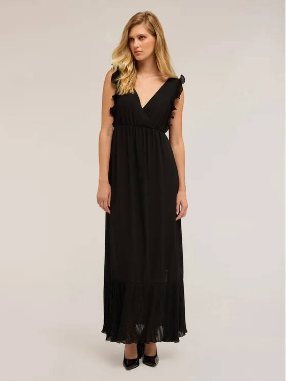 Vestito lungo in georgette; scollo a V con incrocio anteriore, chiusura con zip nel centro dietro; maniche ad aletta e bordo al fondo plissé