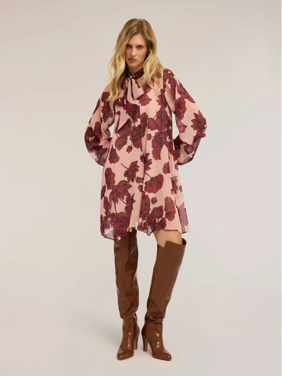 Vestito in creponne dalla stampa floreale; scollatura frontale a v con motivo a fiocco; maniche lunghe ampie con elastico sul fondo; sottoveste in fodera in tinta