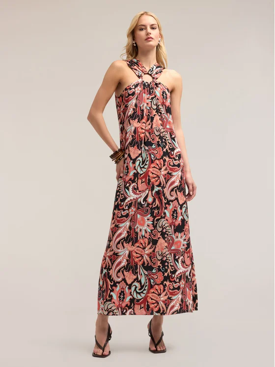 Vestito lungo in tessuto fluido misto lyocell fantasia etnica; scollatura halter con dettaglio ad oblò; linea diritta e svasata sul fondo
