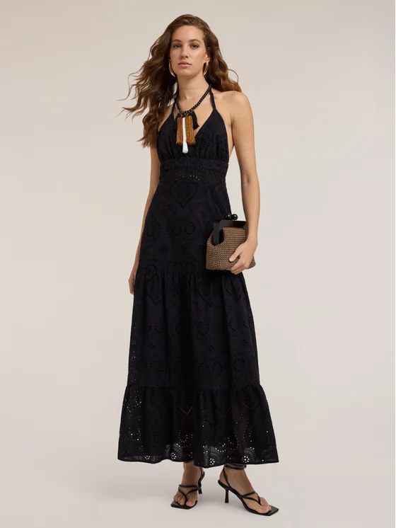 Maxi dress in sangallo con fodera interna; scollatura a cuore con lacci regolabili; fascia elastica sotto seno, gonna lunga a balze