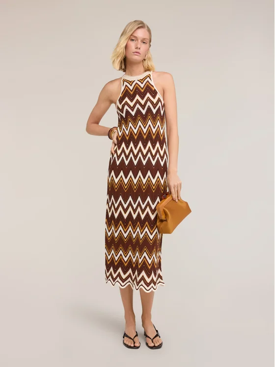 Vestito lungo in filato misto viscosa lurex lavorato con motivo chevron; modello lungo senza chiusura; scollatura all'americana con apertura a goccia posteriore
