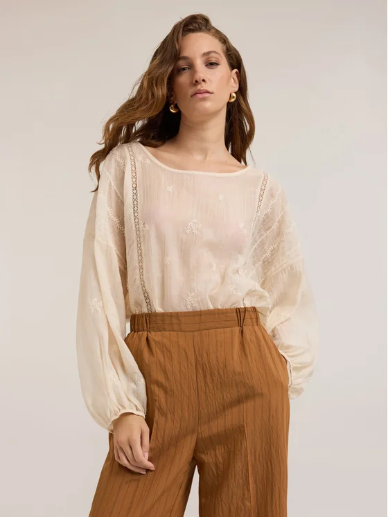 Blusa ricamata in mussola misto lyocell; ampio scollo a barca frontale; maniche lunghe ampie con elastico sul fondo