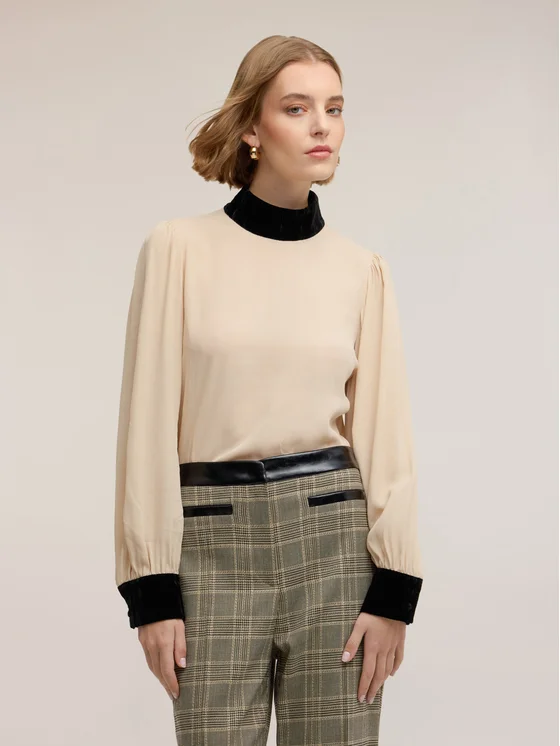 Blusa in tessuto crêpe di viscosa con dettagli in velluto; scollatura con collo alto e apertura a goccia posteriore; maniche lunghe a sbuffo con polsini a contrasto.