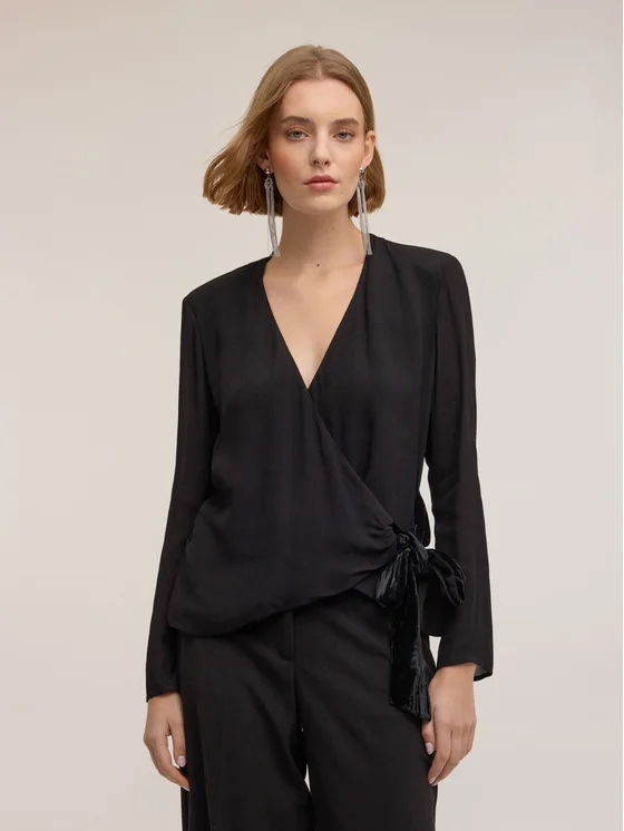 Blusa in tessuto fluido di viscosa; vestibilità regular, chiusura ad incrocio con fiocco in velluto; scollatura a v, maniche lunghe.