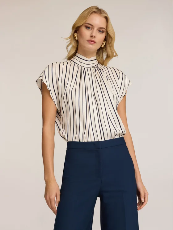 Blusa over in tessuto fluido di viscosa a righe; collo alto con motivo a fiocco posteriore; maniche corte con taglio a kimono