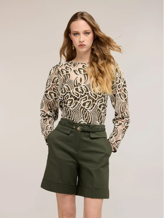 Blusa in pizzo sangallo con top interno; vestibilità regular, scollatura girocollo con motivo a goccia posteriore; maniche lunghe a palloncino.