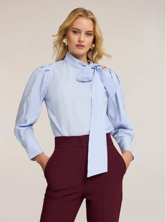 Blusa in popeline di cotone fantasia a righe; scollatura tonda con apertura laterale e fiocco; maniche ampie con pieghe e polsino alto sul fondo