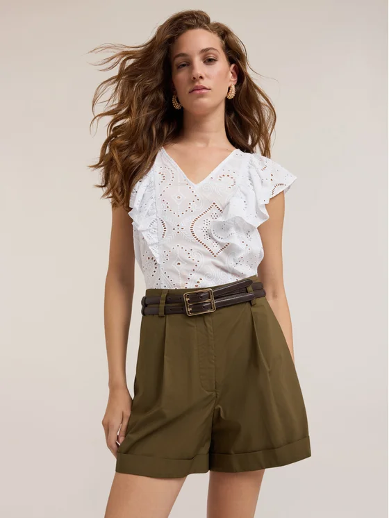 Blusa in pizzo sangallo; scollatura a v frontale; maniche corte con taglio a volant