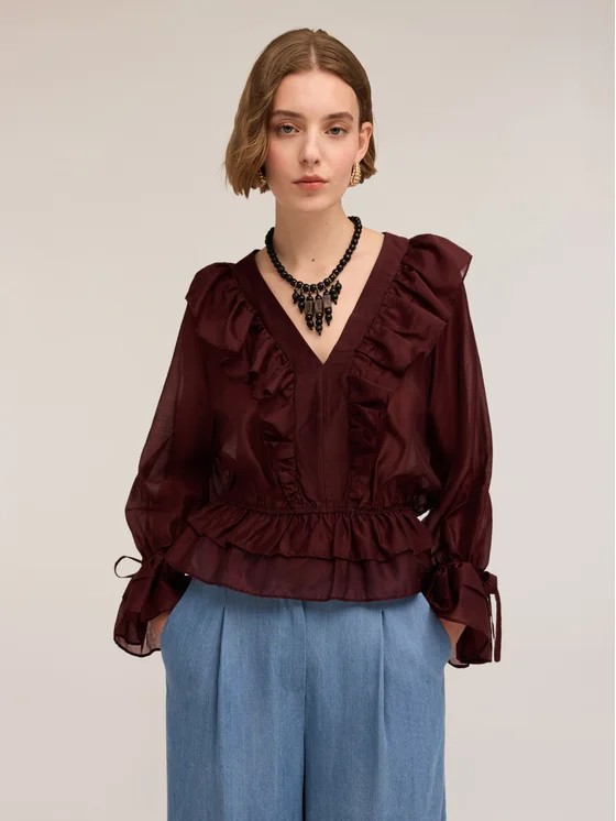 Blusa in voile misto lyocell con dettagli rouches e volants; scollatura a v frontale con bordo a corolla; maniche lunghe con elastico sul fondo