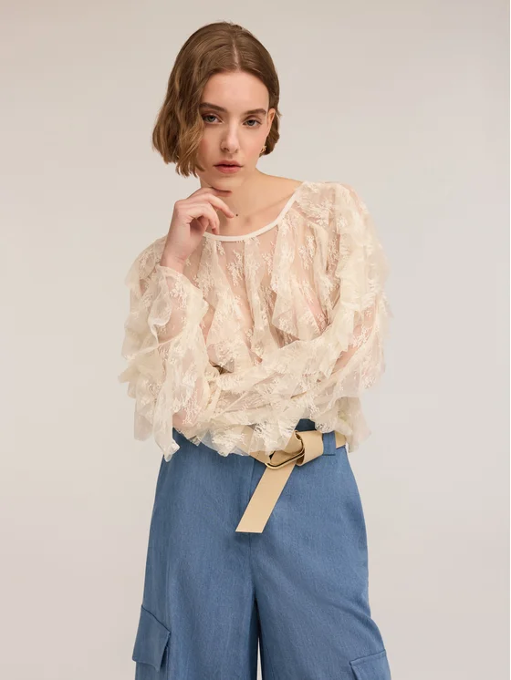 Blusa in pizzo con dettaglio di rouches; scollatura a barca frontale; maniche lunghe