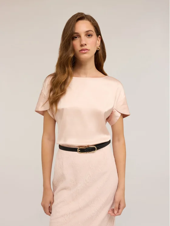 Blusa in raso di viscosa stretch; maniche corte a petalo, con pieghe; scollo a barca e linea dritta