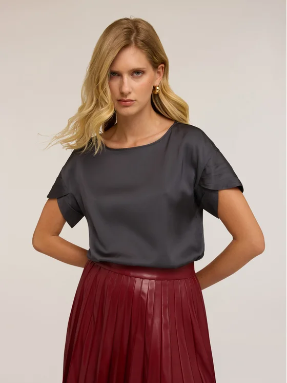 Blusa in raso di viscosa stretch; maniche corte a petalo, con pieghe; scollo a barca e linea dritta