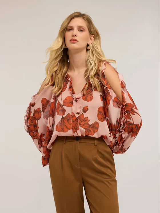Blusa in creponne dalla stampa floreale; scollo a V, maniche ampie con apertura sulle spalle; volants decorativi davanti e sulle maniche