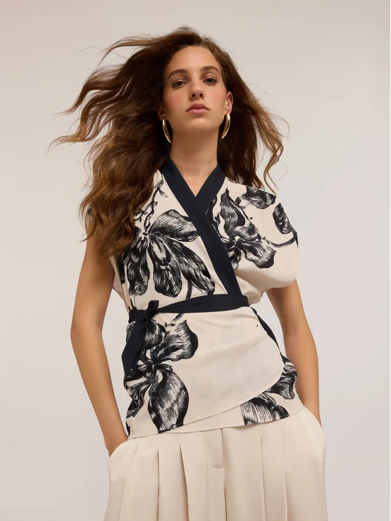 Top in marocaine di viscosa stampata con bordi in tinta unita; scollo a V con chiusura ad incrocio; maniche corte a kimono