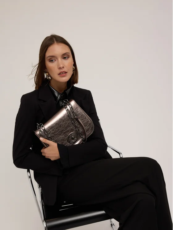 Medium bag in tessuto laminato argento; tracolla regolabile a catena, doppio vano interno, chiusura a nottolino Double Love; dimensioni: altezza 20 cm, larghezza 25 cm, ampiezza 9 cm